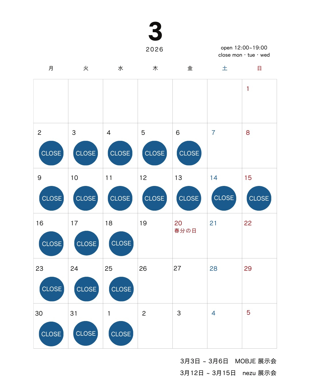 3月の実店舗の営業日です。